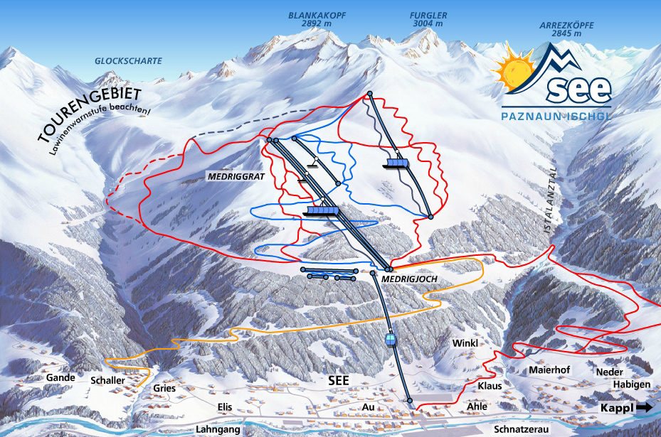 See:Höhe: 1050 m - 2450 m Piste: 41 km Lifte: 5 Skigebietsplan: See Schneesicherheit in Ischgl von Dezember bis Mai Skipass