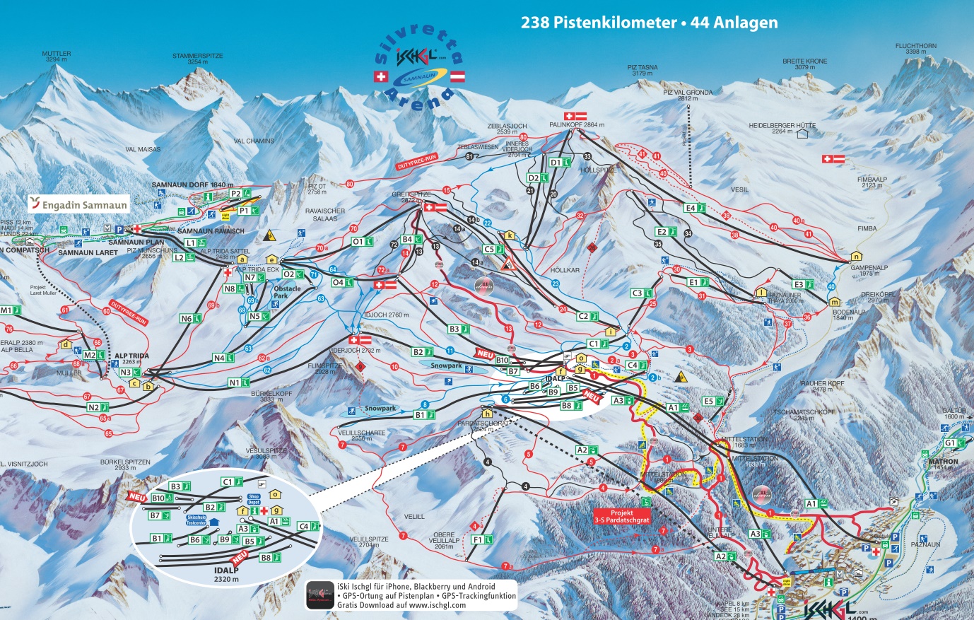 Dreh- und Angelpunkt ist die Idalp auf 2320 m. Unzählige Pisten, Tiefschneehänge, Rinnen und Jumps stehen den Fans des weißen Sports zur Verfügung. Hervorzuheben sind nicht nur die bestens präparierten Pisten für alle Könnensstufen, sondern auch die hervorragende Erschließung des Skigebietes mit mehr als 44 modernsten Lift- und Seilbahnanlagen, die keine Wartezeiten entstehen lassen. Für Snowboarder und New-School-Skifahrer gibt es eine Halfpipe und einen Funpark mit 4 Areas im Herzen des Skigebiets. Auch Carvingfreaks kommen in der eignes eingerichteten Strecke voll auf ihre Kosten! Für Langläufer stehen 74 km Loipe zur Verfügung. Skigebiet Ischgl: Höhe: 1400 m - 2864 m Pistenkilometer: 235 km • 48 km leicht • 148 km mittel • 27 km schwierig • 12 km Skirouten Lifte: 39 Skipass