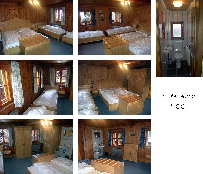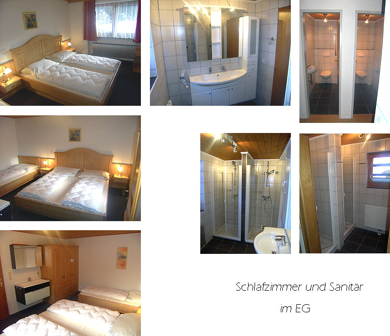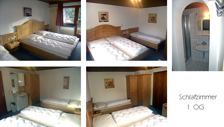 Wohn-/Schlafzimmer im Obergeschoss 1 Dreibettzimmer mit Doppelbett und Einzelbett. 1 Schlafzimmer mit französischem Bett (1,60 m). 1 Schlafzimmer mit 2 Einzelbetten. Wohnschlafzimmer mit Doppelbett, Einzelbett, Couchecke, Sat-TV und Balkon. Wohnküche mit 4-Plattenherd, Backofen, Mikrowelle, Geschirrspüler, Toaster, Wasserkocher, Kühl-/Gefrierkombination, Essecke, Balkon. Ein Bad mit Dusche, Badewanne und WC.