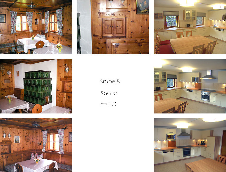 Eingangsbereich und Treppenhaus. Gemütliche, holzvertäfelte Stube für ca. 20 Personen mit Kachelofen (nur Dekoration), Sat-TV, DVD-Player, Kühlschrank. Geräumige, neue Küche mit 2 x 4-Plattenherd, Backofen, Mikrowelle, Geschirrspüler, Toaster, Wasserkocher, Kühlschrank mit Gefrierfach, Essecke, Durchreiche zur Stube. 1 Dreibettzimmer mit Waschbecken. 2 getrennte WCs. 1 Bad mit Waschbecken und 2 Duschkabinen. 1 Bad mit 2 Duschkabinen.
